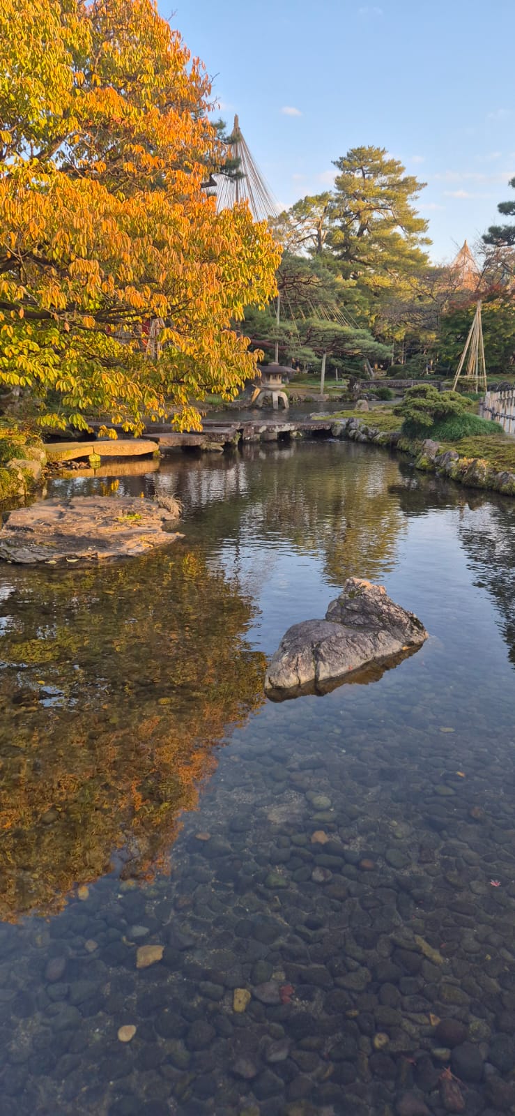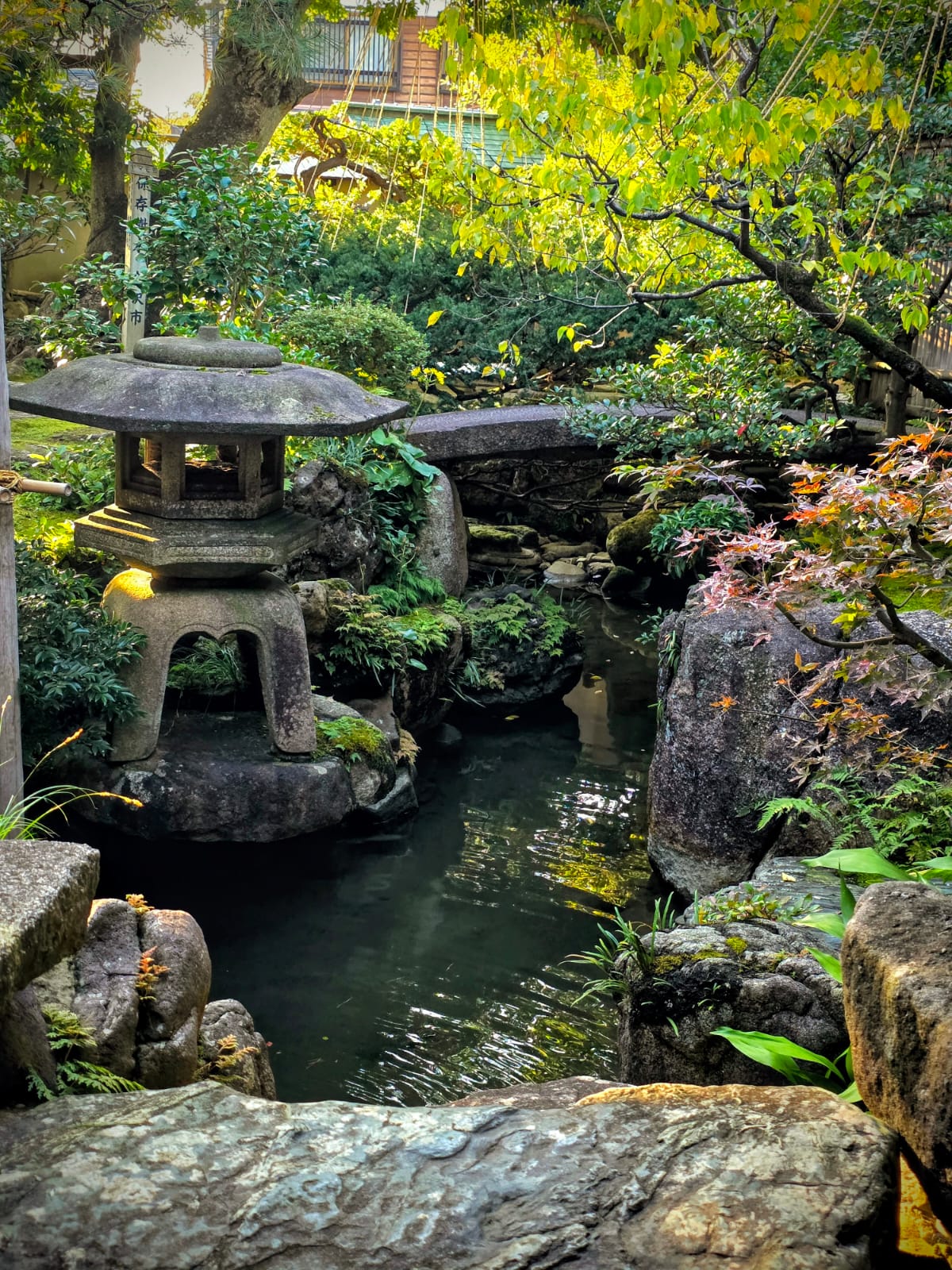 פנס אבן מסורתי מעל תעלת מים – מוטיב קלאסי בגני קנאזווה.